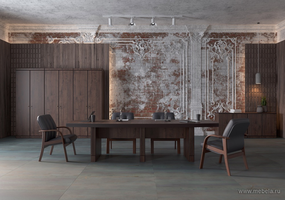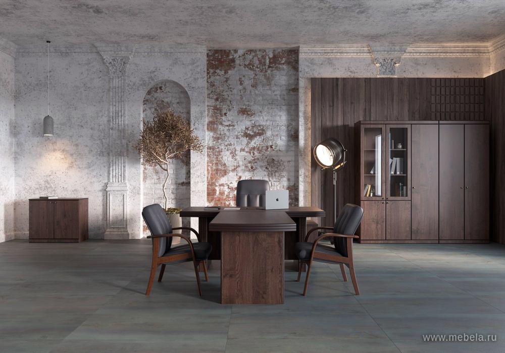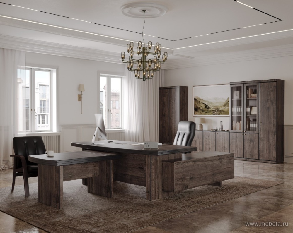 Мебель для кабинетов “Капитал” в цвете дуб апрельский создает внушительный солидный образ для установившей ее в свой интерьер компании. Шпон выглядит очень дорого, а классические линии и формы подчеркивают серьезность намерений владельцев такого интерьера.