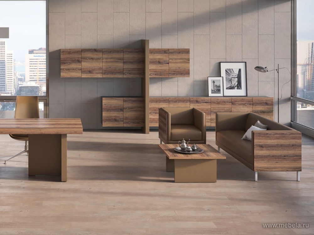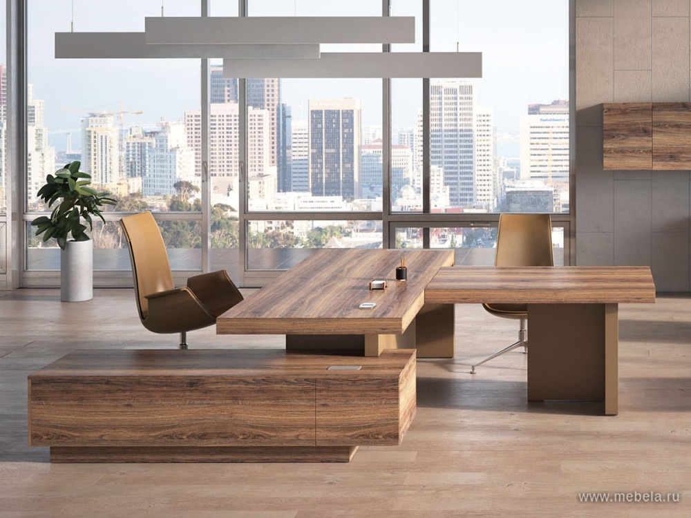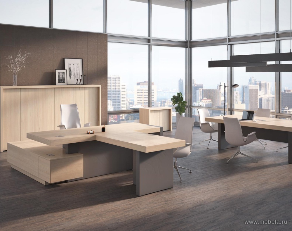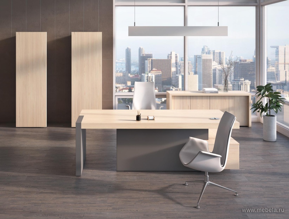 Вся офисная мебель производится из ЛДСП, современного материала, устойчивого к механическому воздействию, с толщиной столешниц 90 мм. Выбор цвета мебели — от светлого до темно-коричневого. Кабинет руководителя Era включает в себя только самые необходимые мебельные элементы, с помощью которых можно г...