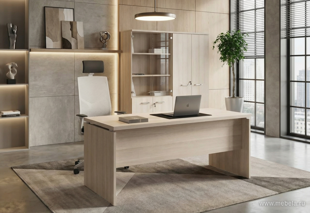 Когда требуется создать светлый и современный дизайн кабинета руководителя, то коллекция Fermo Light подходит для этого идеально. Легкость здесь прослеживается в каждой линии столов, а также в цвете их панелей выбеленного дуба, который легко моется благодаря ламинированному покрытию.