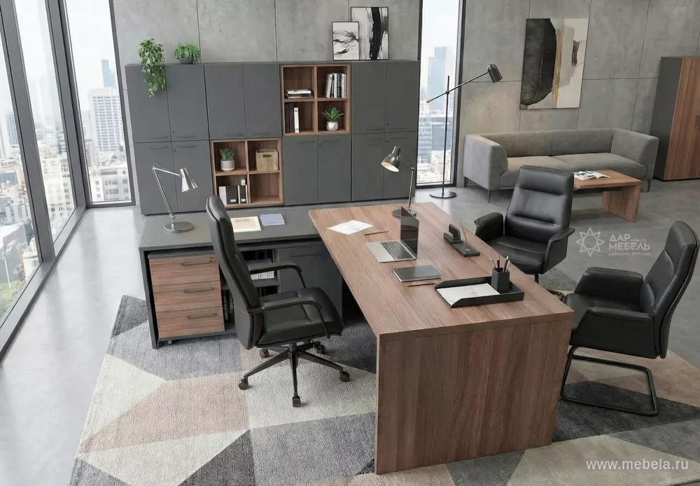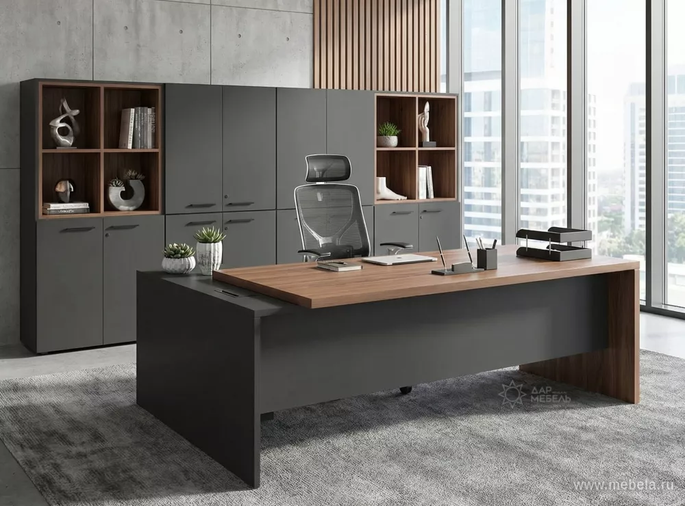Кабинет для руководителя Кортез (Kortez) в цвете тёмный шимо - это не только рабочее пространство, но и место, где можно провести время с коллегами и партнерами. Он должен быть стильным, уютным и функциональным. В кабинете для руководителя должны быть удобные кресла, стол, шкафы для документов и другие необходимые предметы.