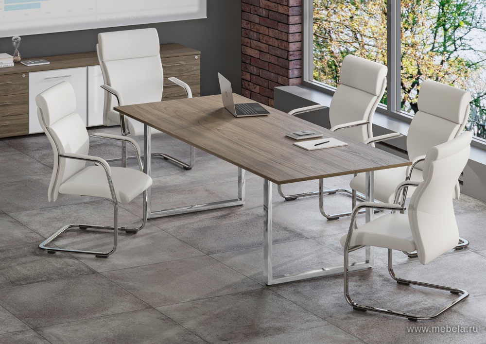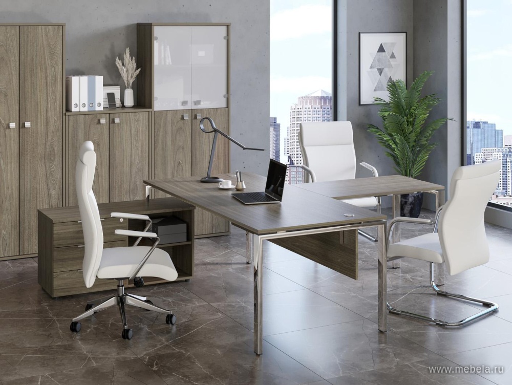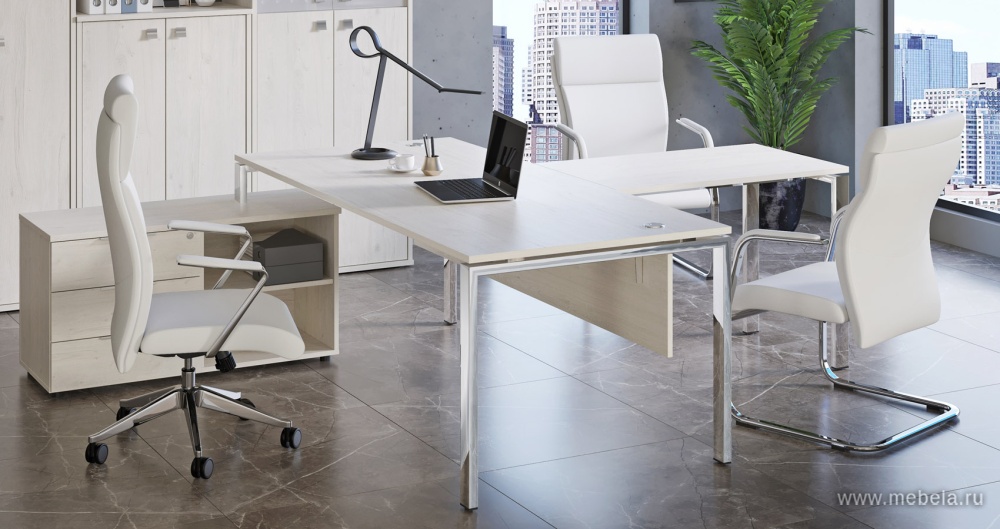 Это легкая, практичная и функциональная мебель с продуманным дизайном в стиле минимализма. Мебельная комплектация позволяет разделить пространство кабинета на три основные зоны: рабочую, зону отдыха и переговоров. Стол с дополнительной тумбой и закрытой передней зоной имеет рабочую приставку с одной опорой.