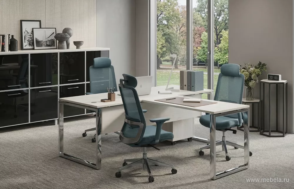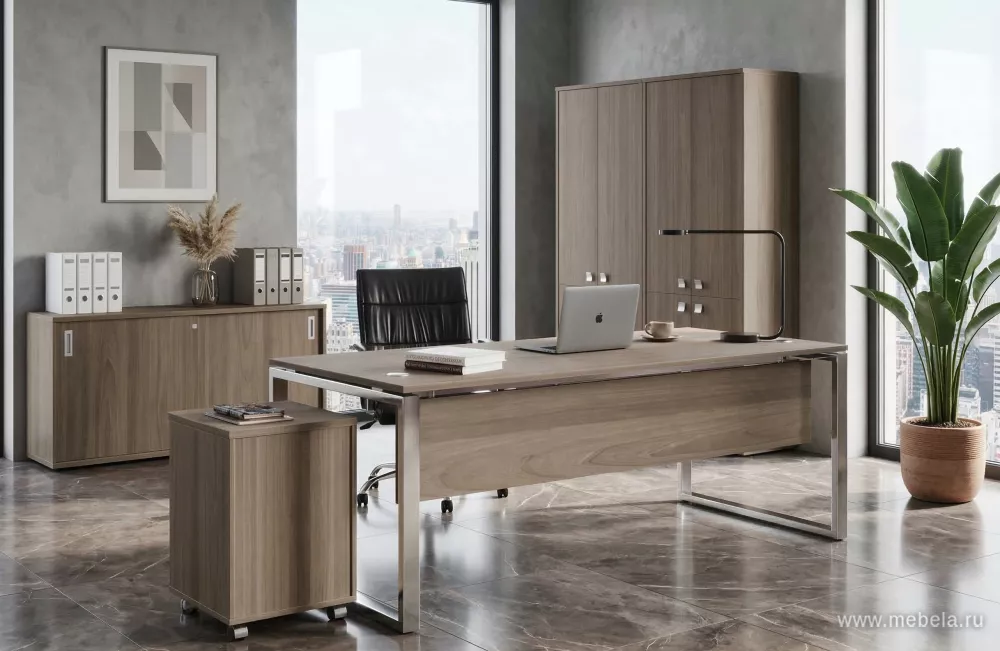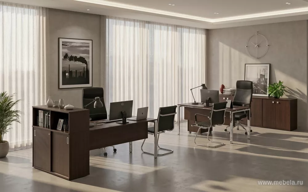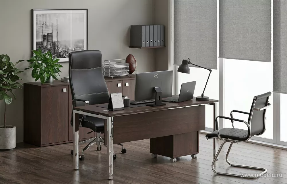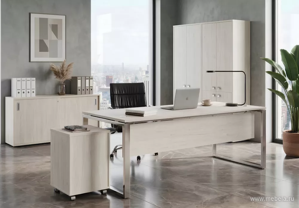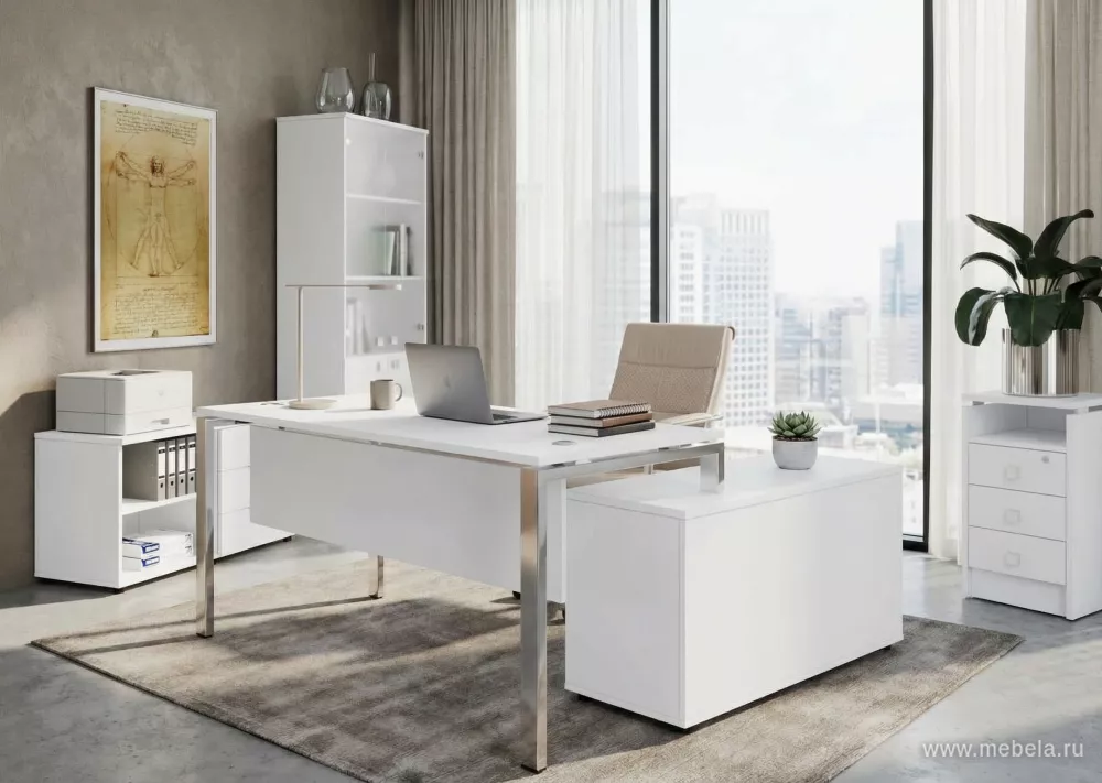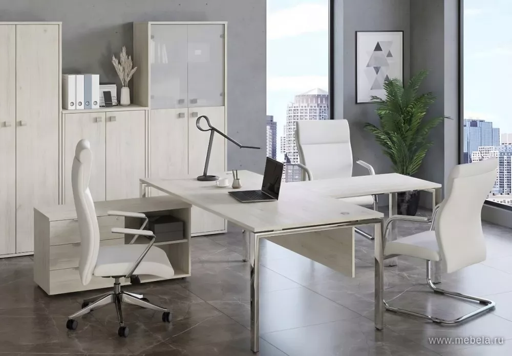 Это легкая, практичная и функциональная мебель с продуманным дизайном в стиле минимализма. Мебельная комплектация позволяет разделить пространство кабинета на три основные зоны: рабочую, зону отдыха и переговоров. Стол с дополнительной тумбой и закрытой передней зоной имеет рабочую приставку с одной опорой.