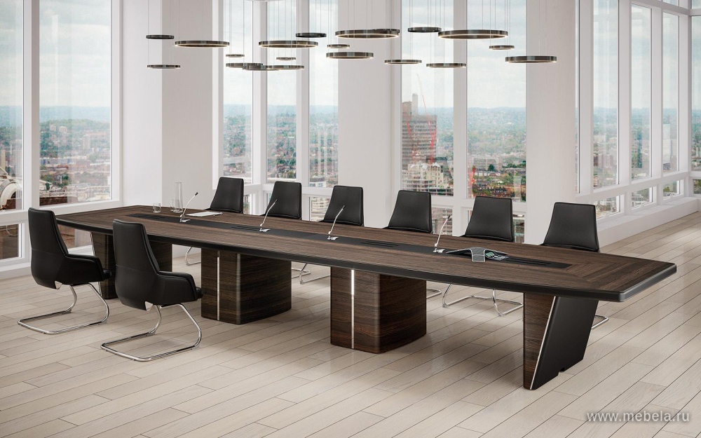 Новая роскошная мебель в минималистическом и утонченном современном стиле для солидных руководителей. Лаконичные сдержанные формы, натуральные оттенки светлых и темных полос дуба ондо, выделенные кромки и элегантные вставки из экокожи на столешнице и брифингах по торцу создают позитивную атмосферу для работы.
