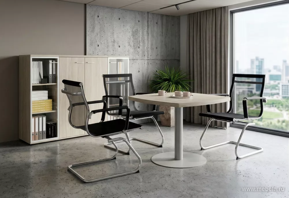 Кабинет руководителя Wing White - комфортный и функциональный комплект мебели, отражает последние тенденции эргономики и дизайна рабочего пространства. В нем солидность форм сочетается с лаконичностью, а благородный цвет светлого дуба подчеркивается матовым металлом ручек и зеркальным блеском стекла в шкафах.