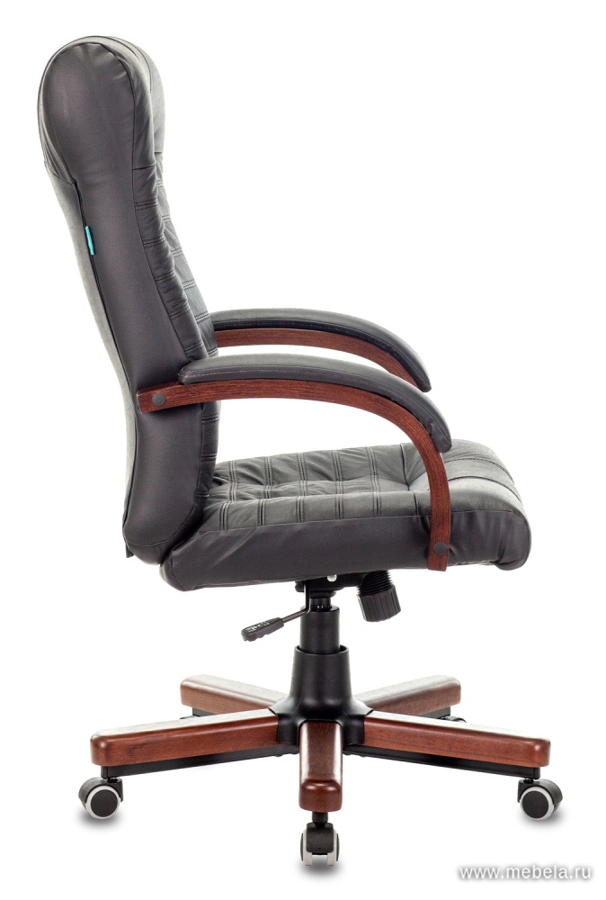 KB-10 Walnut имеет практичную обивку из черной экокожи. С таким материалом идеально сочетается дерево оттенка “орех”. Из этого материала сделаны подлокотники, внешнее оформление основания. Крестовина пятилучевой формы, с колесиками. Дополнительную эргономичность придает продуманная форма спинки и сидения, возможность отрегулировать механизм качания по весу.