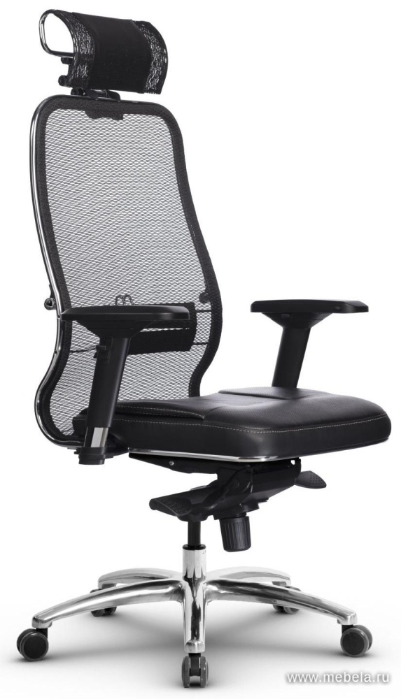 Кресло, сочетающее два типа обивки: натуральную перфорированную кожу и сетчатую ткань. Кожа подбирается в тон сетке. Особую оригинальность модели придает подголовник, прикрепленный на хромированное изогнутое основание. Подойдет руководителю.