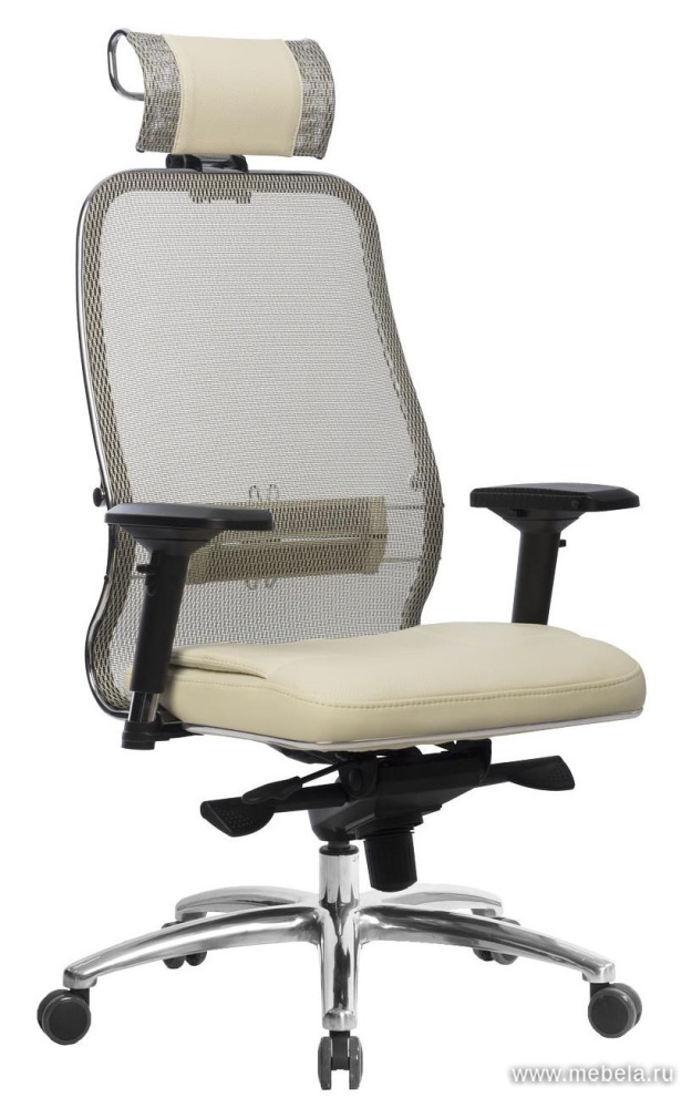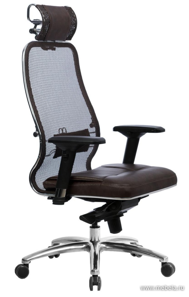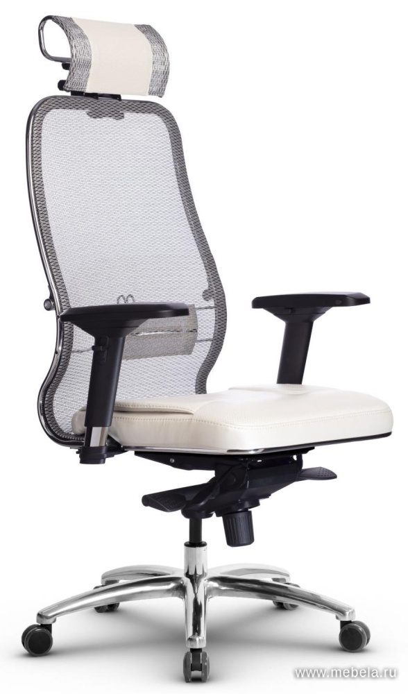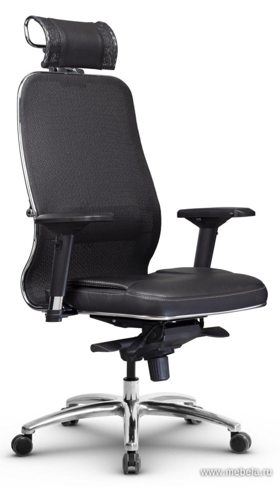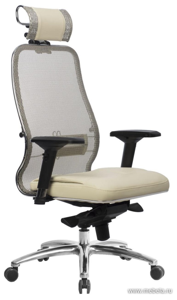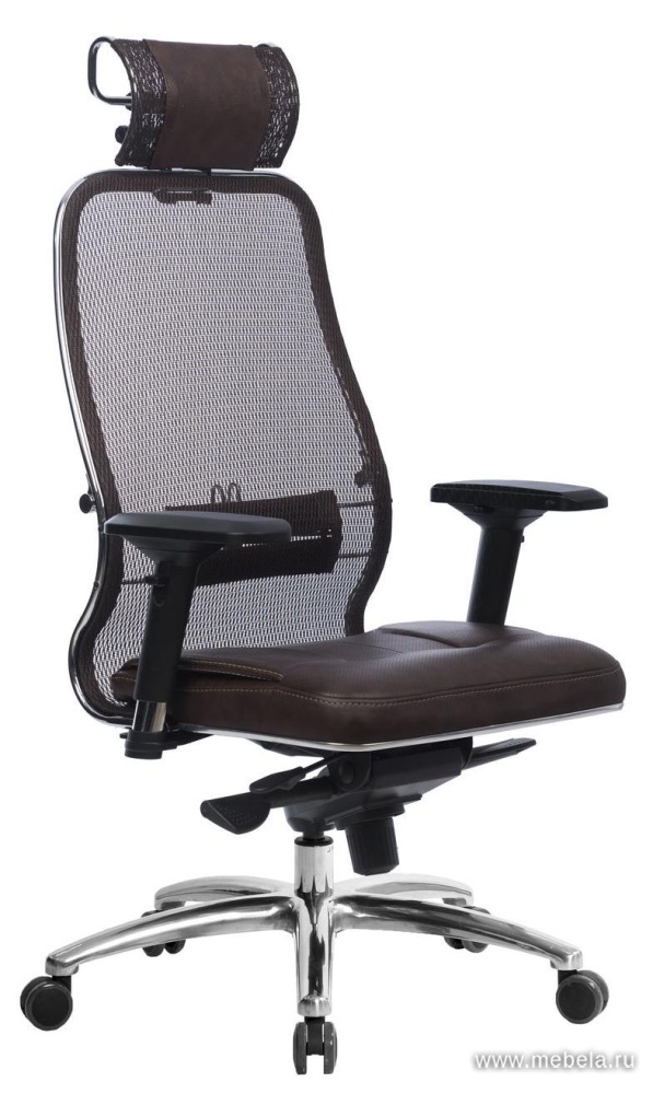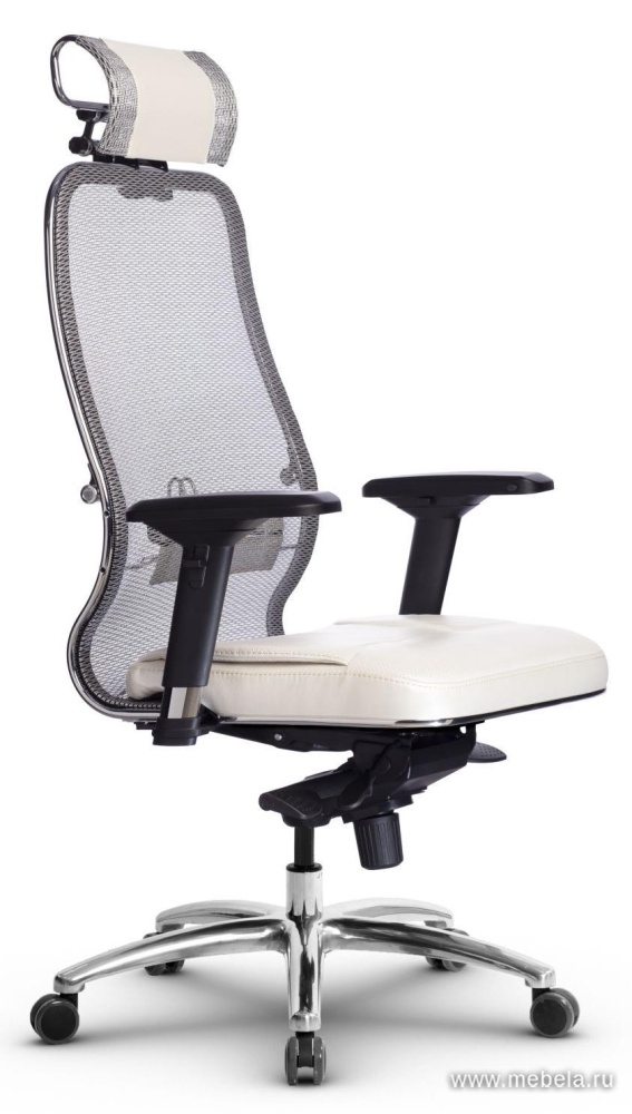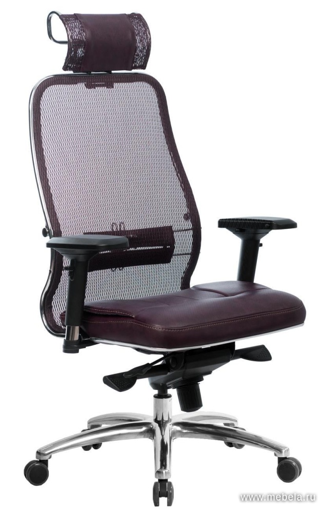 Кресло, сочетающее два типа обивки: натуральную перфорированную кожу и сетчатую ткань. Кожа подбирается в тон сетке. Особую оригинальность модели придает подголовник, прикрепленный на хромированное изогнутое основание. Подойдет руководителю.
