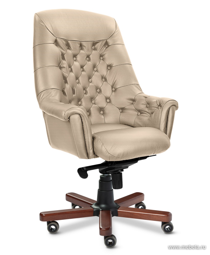 Крестовина оборудована колесиками, поэтому кресло легко передвигать по кабинету при необходимости. Нижняя часть выполнена из дерева. Обивка из натуральной кожи доступна в двух оттенках: черном и цветном. Спинка декорирована геометрическим узором и пуговицами в тон обивки. Модель подойдет для классического офисного интерьера или помещения в английском, колониальном стилях.