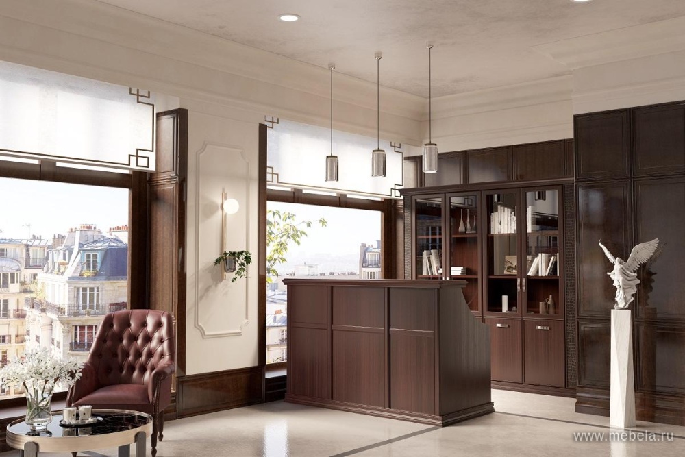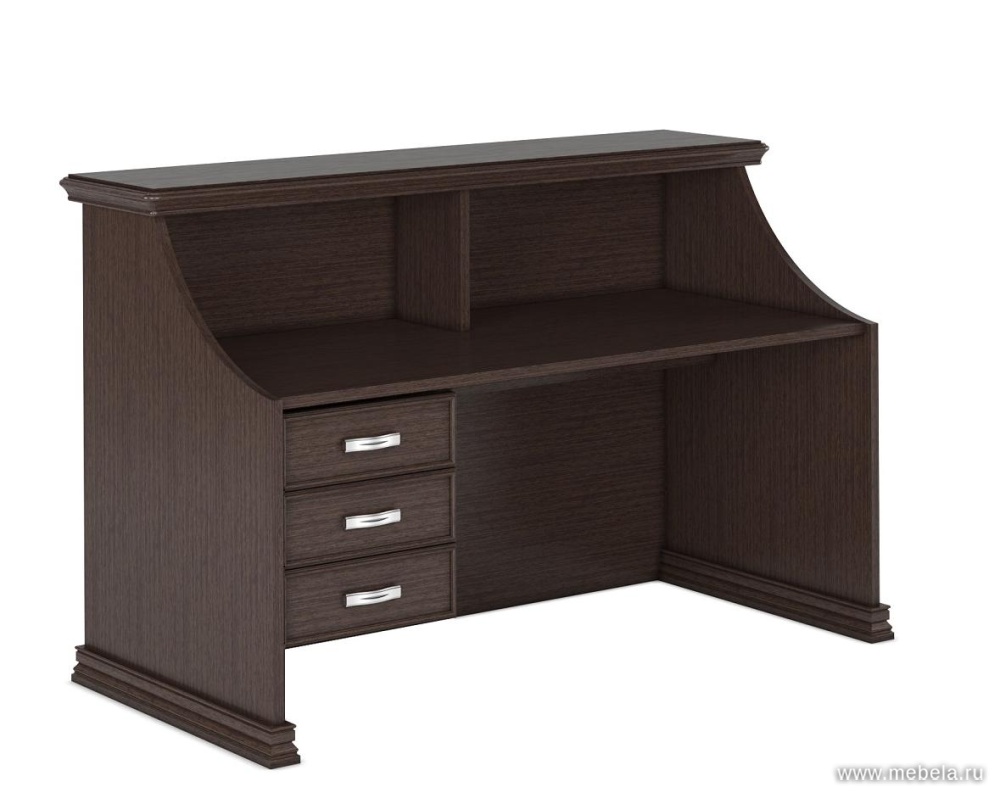 Нет лучшего способа подчеркнуть высокий статус компании, чем оформить ее приемную в классических элементах интерьера. С этой задачей прекрасно справляются стойки ресепшн “Порто”, выполненные в изящных и солидных формах с использованием цвета дуб кофейный и орех классик.