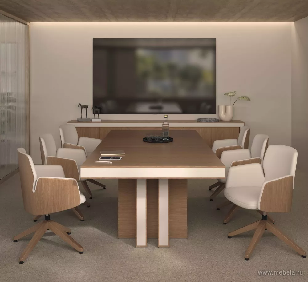 Контрастная обработка торцов по отношению к основному цвету панелей сразу же делает столы для переговоров Belesa центром вашего офисного интерьера. Форма опор и стиль оформления похожи на колонны, что в сочетании с натуральной древесиной повышает статус столов. 2 варианта цвета позволит создать совершенно разные образы, в зависимости от особенностей вашего интерьера.