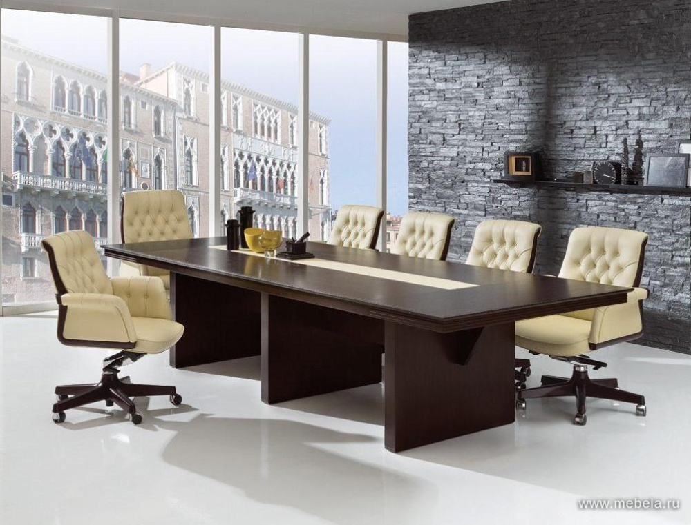 Итальянские дизайнеры блестяще доказали столами для переговоров Еур (Eur), что классические формы и яркий современный внешний вид прекрасно уживаются друг с другом. Стильный контраст темного шпона и белой кожи создают объемный образ, подчеркивающий открытость новым идеям при проведении совещаний.