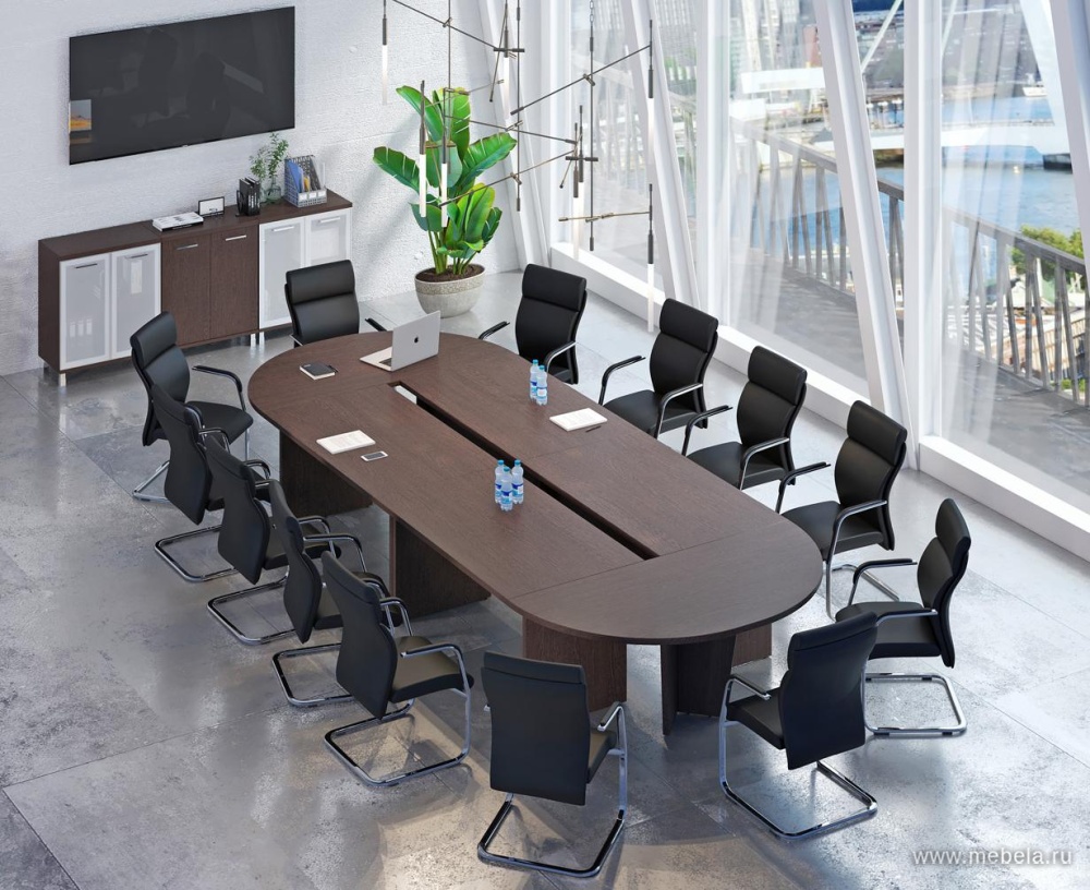 Столы для переговоров Фёст Венге одинаково хорошо подойдут для создания классического или современного открытого интерьера. Для этого в комплекте гарнитура есть мебель на глухих ДСП панелях-опорах или на металлизированных прямоугольных ножках. Прямоугольные или закругленные формы придадут офису желаемый стиль.