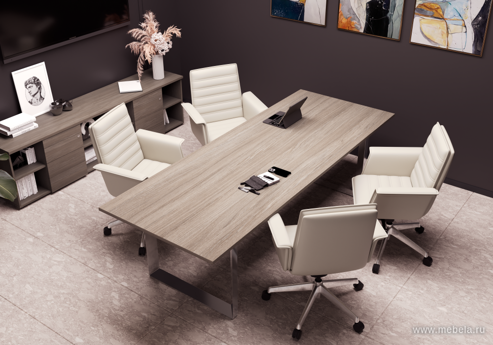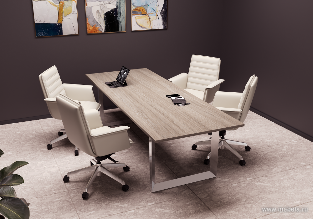 Лаконичный дизайн прочной и устойчивой столешницы из ЛДСП толщиной 25мм, в оттенках от белого до коричневого цвета и строгие линии металлических ножек в форме прямоугольника гармонично вписываются в интерьер и создают в комнате официальную обстановку. Конференц-стол рассчитан на 8 человек, при этом ...