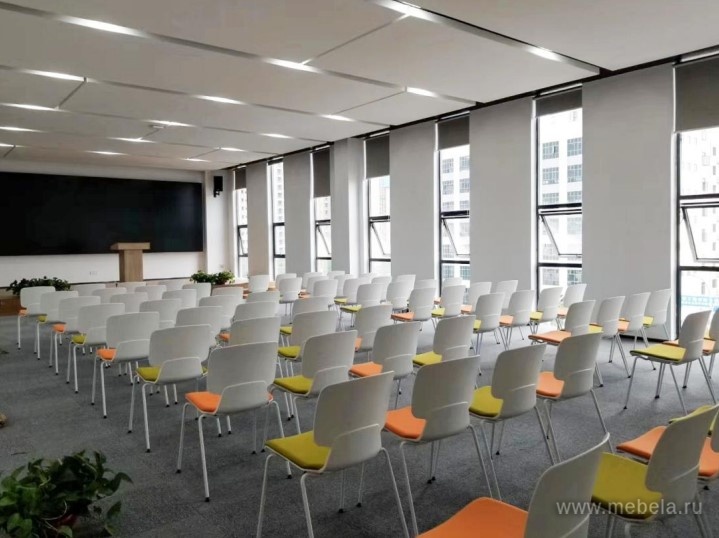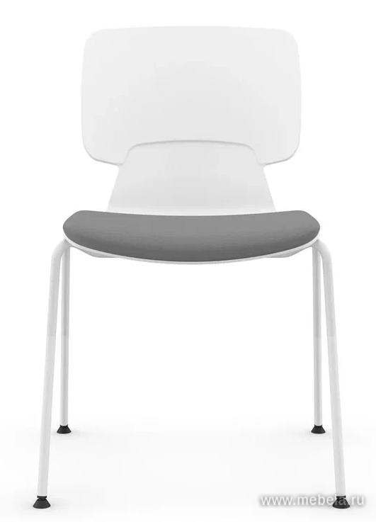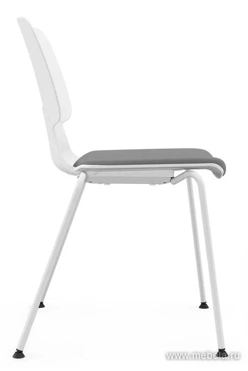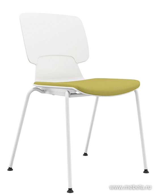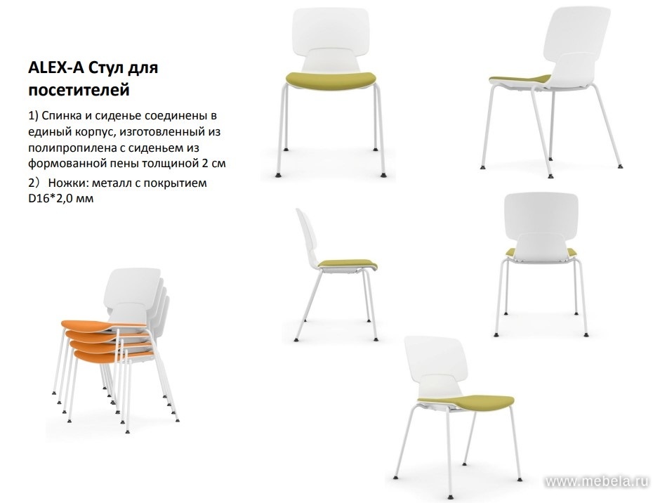 Стул Alex-A имеет тканевое сиденье, в трех цветах, спинка выполнена из пластика. Каркас выполнен из металлической трубы диаметром 16 мм с белым порошковым покрытием, толщина стенки - 2 мм, опоры каркаса снабжены подпятниками на подвижных шарнирах, кресла штабелируются по вертикали.
