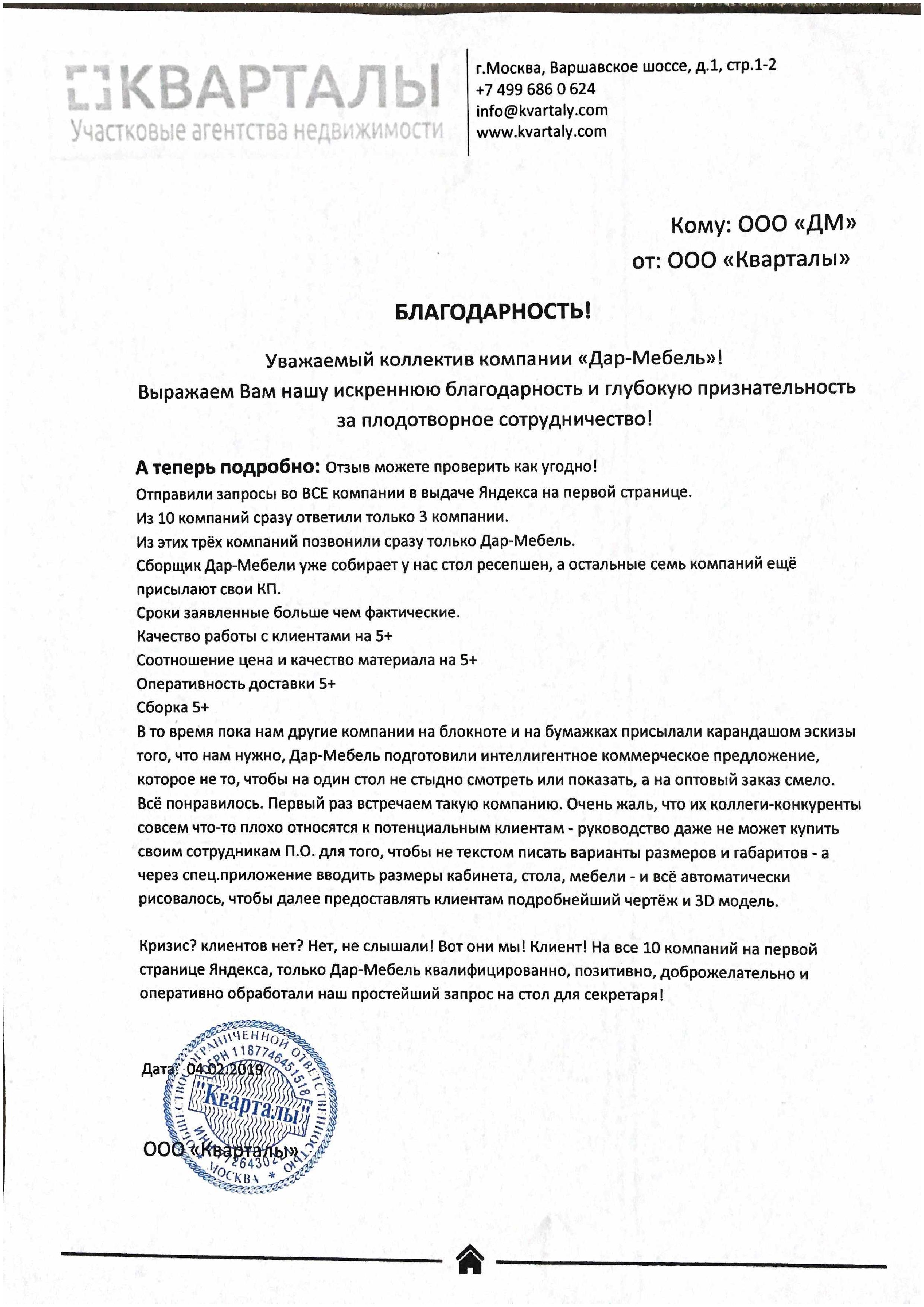 Уважаемый коллектив компании ДАР-МЕБЕЛЬ! Выражаем Вам нашу искреннюю благодарность и глубокую признательность за плодотворное сотрудничество! Отзыв можете проверить как вам удобно! Отправил запросы во все компании в выдаче яндексе на первой странице. Из 10 компаний сразу ответили только 3 компании. Из этих трёх компаний позвонили сразу только Дар-Мебель. Сборщик Дар-Мебели уже собирает у меня стол ресепшен, а остальные семь компаний ещё присылают свои КП. Сроки заявленные, больше чем фактические. Качество работы с клиентами 5+ Соотношение цена и качество 5+ Оперативность доставки 5+ Сборка 5+ В то время пока мне другие компании на блокноте и на бумажках присылали карандашом эскизы того, что мне нужно, Дар-Мебедь подготовили интеллигентное коммерческое предложение, которое не то, чтобы на один стол не стыдно смотреть или показать, а на оптовый заказ смело. Всё понравилось. Первый раз встречаю такую компанию. Очень жаль, что коллеги-конкуренты совсем наплевательски относятся к клиентам - руководство даже не может купить себе П.О. для того, чтобы не текстом писать варианты размеров и габаритов - а через спец.приложение вводить размеры кабинета, стола, мебели - и всё автоматически рисовалось, чтобы далее предоставлять клиентам подробнейший чертёж и 3D модель. Кризис? Киентов нет? Нет, не слышал! Вот он Я! Клиент! На все 10 компаний на первой странице Яндекса, только Дар-Мебель квалифицированно, позитивно, доброжелательно и оперативно обработали наш простейший запрос на стол для секретаря!