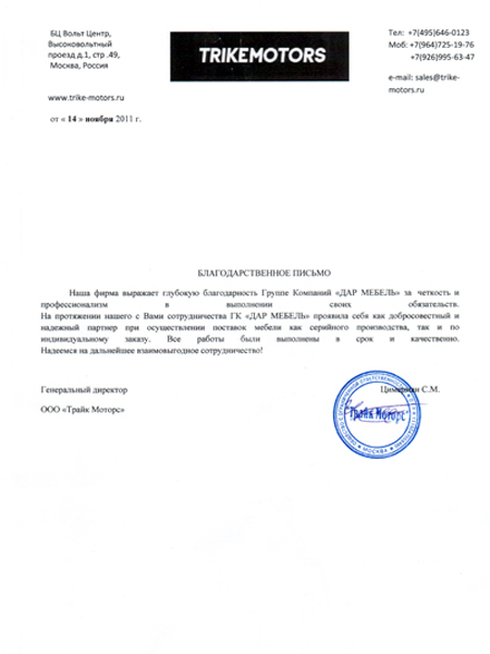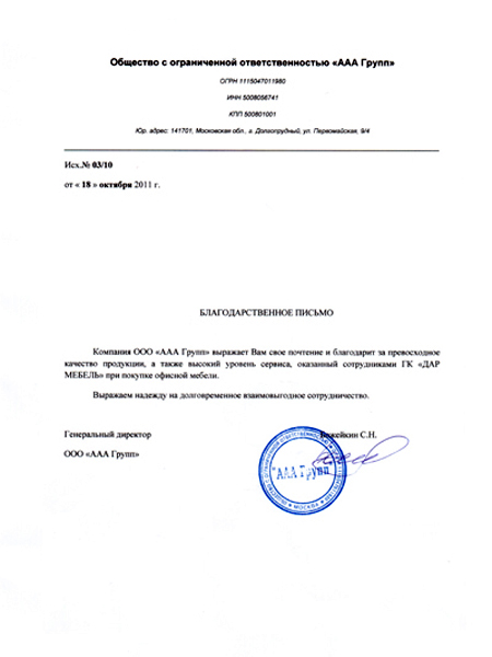 Компания ООО "ААА Групп" выражает Вам свое почтение и благодарит за превосходное качество продукции, а так же высокий уровень сервиса оказанный сотрудниками ГК "ДАР МЕБЕЛЬ" при покупке офисной мебели. Выражаем надежду на долгосрочное и взаимовыгодное сотрудничество.