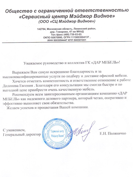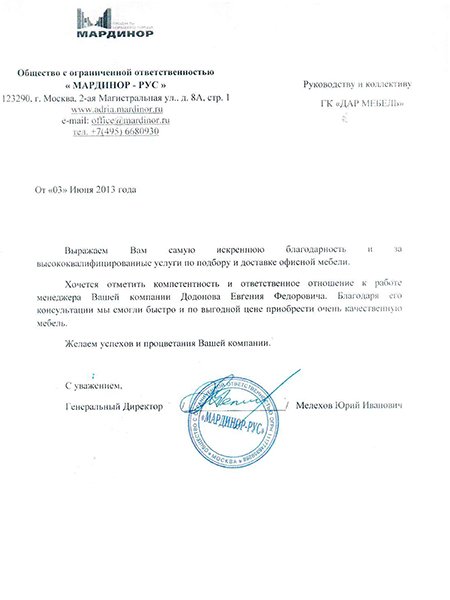 Уважаемое руководство и коллектив ГК "ДАР МЕБЕЛЬ" Выражаем Вам самую искреннюю благодарность и за высококвалифицированные услуги по подбору и доставке офисной мебели. Хочется отметить компетентность и ответственное отношение к работе Додонова Евгения. Благодаря его консультациям мы смогли быстро и по выгодной цене приобрести очень качественную мебель. Рекомендуем всем заинтересованным организациям компанию "ДАР МЕБЕЛЬ" как надежного делового партнера,который четко, оперативно и эффективно выполняет свои обязательства. Желаем успехов и процветания Вашей компании.