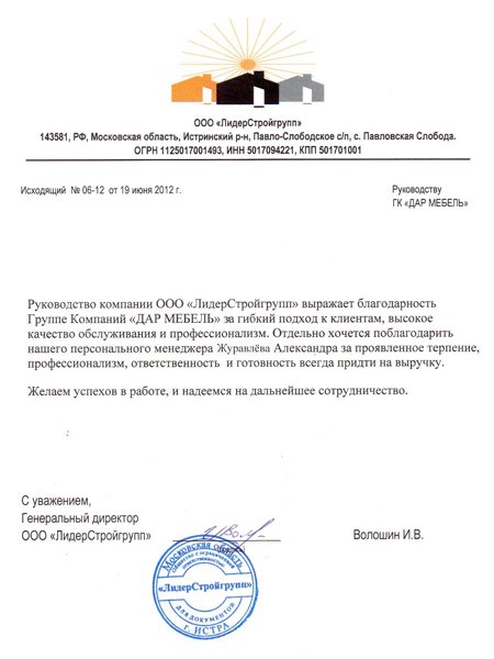 Руководство компании ООО "ЛидерСТройГрупп" выражает благодарность Группе Компаний "ДАР МЕБЕЛЬ" за гибкий подход к клиентам,высокое качество обслуживания и профессионализм. Отдельно хочется поблагодарить нашего персонального менеджера Журавлева Александра за проявленное терпение,профессионализм,ответственность и готов всегда придти на выручку. Желаем успехов в работе, и надеемся на дальнейшее сотрудничество.