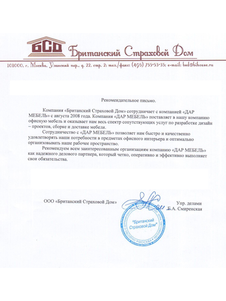 Компания "Британский Страховой Дом" сотрудничает с компанией "ДАР МЕБЕЛЬ" с Августа 2008 года. Компания "ДАР МЕБЕЛЬ" поставляет в нашу компанию офисную мебель и оказывает нам весь спектр сопутствующих услуг по разработке дизайн-проектов, сборке и доставке мебели. Сотрудничество с "ДАР МЕБЕЛЬ" позволяет нам быстро и качественно удовлетворять наши потребности в предметах офисного интерьера и оптимально организовывать наше рабочее пространство. Рекомендуем всем заинтересованным организациям компанию "ДАР МЕБЕЛЬ" как надежного делового партнера, который четко,оперативно и эффективно выполняет свои обязательства.