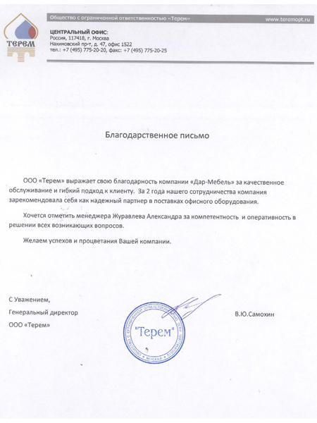ООО "Терем" выражает свою благодарность компании "ДАР МЕБЕЛЬ" за качественное обслуживание и гибкий подход к клиенту. За 2 года нашего сотрудничества компания зарекомендовала себя как надежный партнер в поставках офисного оборудования. Хочется отметить менеджера Журавлева Александра за компетентность и оперативность в решении всех возникающих вопросов. Желаем успехов и процветания Вашей Компании.
