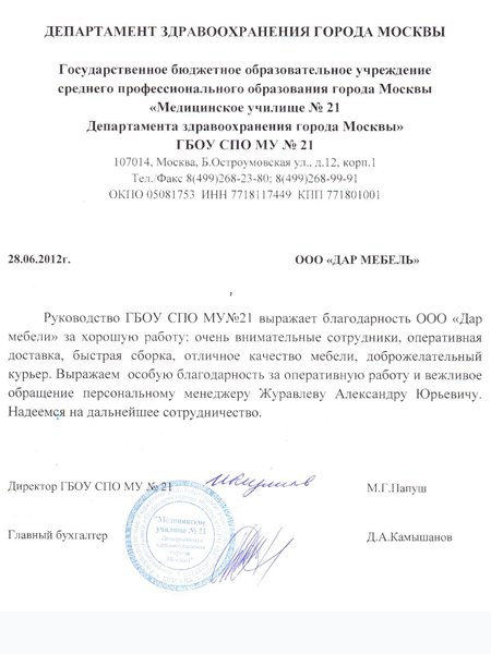 Руководство ГБОУ СПО МУ№21 выражает благодарность ООО "ДАР МЕБЕЛЬ" за хорошую работу: очень внимательные сотрудники,оперативная доставка, быстрая сборка, отличное качество мебели, доброжелательный курьер. Выражаем особую благодарность за оперативную работу и вежливое обращение персональному менеджеру Журавлеву Александру Юрьевичу. Надеемся на дальнейшее сотрудничество.