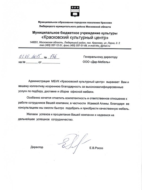 Администрация МБУК "Красковский культурный центр" выражает Вам и вашему коллективу искреннюю благодарность за высококвалифицированные услуги по подбору мебели, доставке и сборке офисной мебели. Особенно хочется отметить компетентность и ответственное отношение к работе сотрудников Вашей компании, в частности Исаевой Алины. Благодаря её консультациям мы смогли быстро подобрать и приобрести качественную мебель. Желаем успехов и процветания Вашей компании и надеемся на дальнейшее успешное сотрудничество.