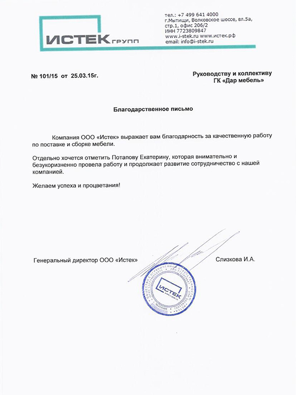 Компания ООО "Истек" выражает Вам благодарность за качественную работу по поставке и сборке мебели. Отдельно хочется отметить Потапову Екатерину, которая внимательно и безукоризненно провела работу и продолжает развитие сотрудничество с нашей Компанией. Желаем успеха и процветания!