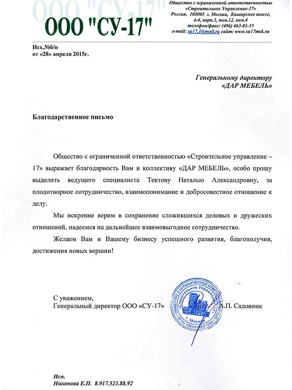 Общество с ограниченной ответственностью "Строительное управление-17" выражает Благодарность Вам и коллективу "ДАР МЕБЕЛЬ", особо прошу выделить ведущего специалиста Тектову Наталью Александрову, за плодотворное сотрудничество, взаимопонимание и добросовестное отношение к делу. Мы искренне верим в сохранение сложившихся деловых и дружеских отношений, надеемся на дальнейшее взаимовыгодное сотрудничество. Желаем Вам и Вашему бизнесу успешного развития, благополучия, достижения новых вершин!