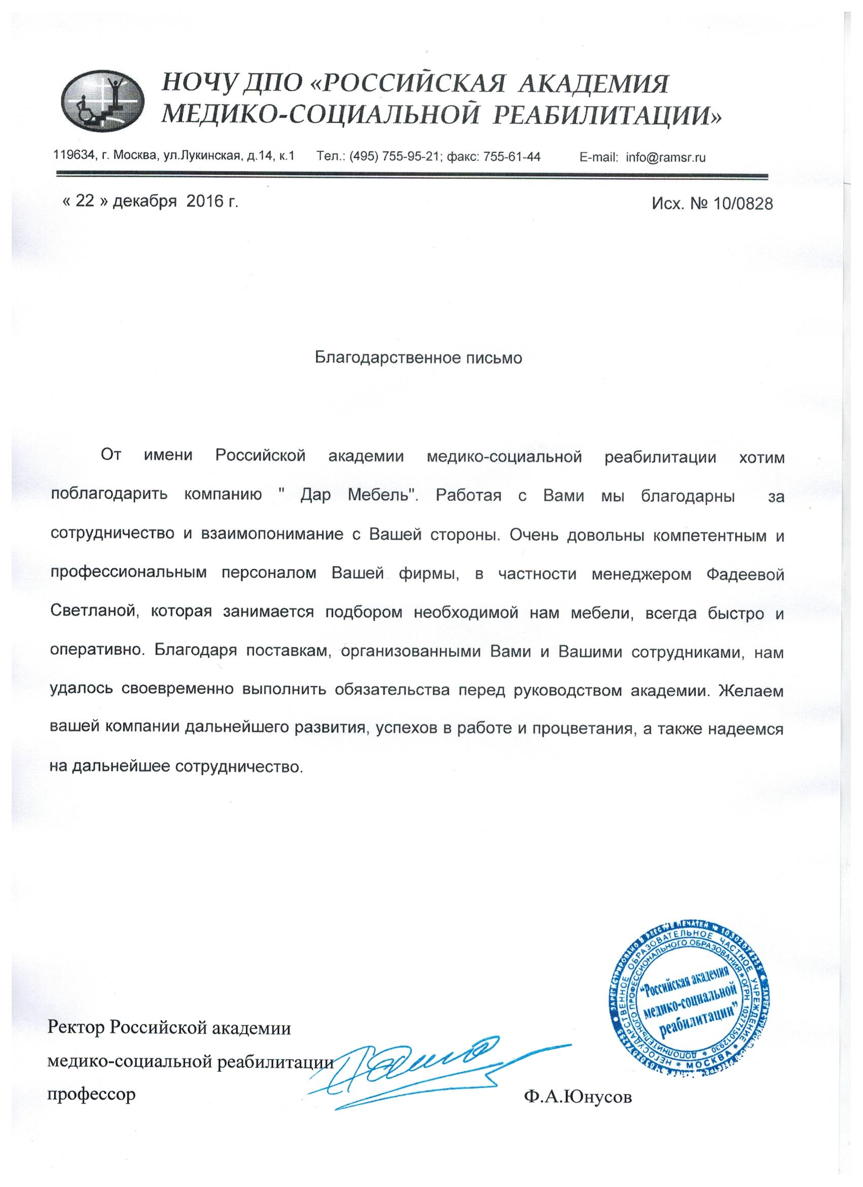 От имени Российской академии медико-социальной реабилитации хотим поблагодарить компанию " Дар мебель" .Работая с Вами мы благодарны Вам за сотрудничество и взаимопонимание с Вашей стороны. Очень довольны компетентным и профессиональным персоналом Вашей фирмы, в частности менеджером Фадеевой Светланой, которая занимается подбором необходимой нам мебели, всегда быстро и оперативно.Благодаря поставкам, организованными Вами и Вашими сотрудниками, нам удалось своевременно выполнить обязательства перед руководством академии. Желаем вашей компании дальнейшего развития, успехов в работе и процветания, а также надеемся на дальнейшее сотрудничество.