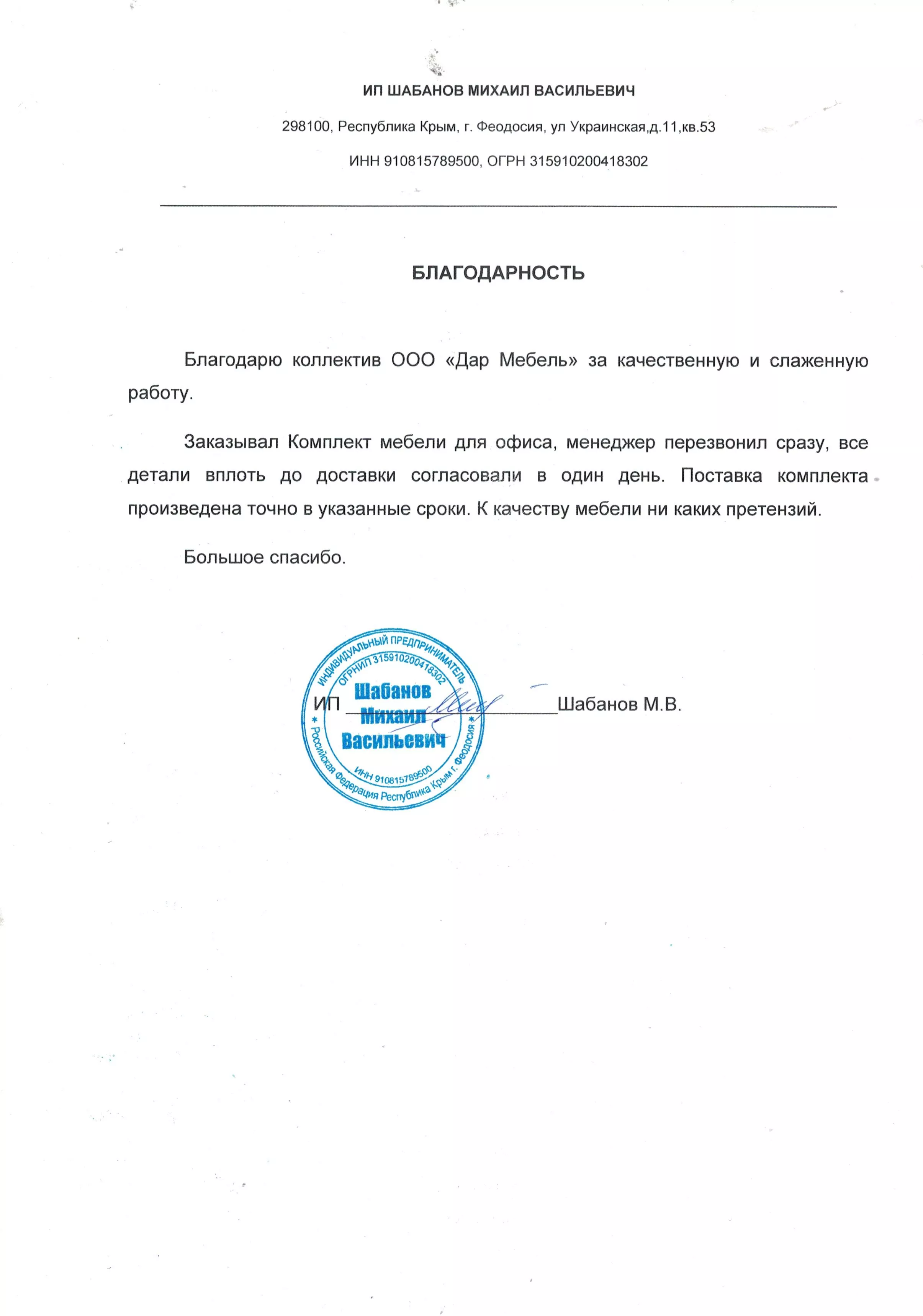 Уважаемый коллектив компании ДАР-МЕБЕЛЬ! Выражаем Вам нашу искреннюю благодарность и глубокую признательность за плодотворное сотрудничество! Отзыв можете проверить как вам удобно! Отправил запросы во все компании в выдаче яндексе на первой странице. Из 10 компаний сразу ответили только 3 компании. Из этих трёх компаний позвонили сразу только Дар-Мебель. Сборщик Дар-Мебели уже собирает у меня стол ресепшен, а остальные семь компаний ещё присылают свои КП. Сроки заявленные, больше чем фактические. Качество работы с клиентами 5+ Соотношение цена и качество 5+ Оперативность доставки 5+ Сборка 5+ В то время пока мне другие компании на блокноте и на бумажках присылали карандашом эскизы того, что мне нужно, Дар-Мебедь подготовили интеллигентное коммерческое предложение, которое не то, чтобы на один стол не стыдно смотреть или показать, а на оптовый заказ смело. Всё понравилось. Первый раз встречаю такую компанию. Очень жаль, что коллеги-конкуренты совсем наплевательски относятся к клиентам - руководство даже не может купить себе П.О. для того, чтобы не текстом писать варианты размеров и габаритов - а через спец.приложение вводить размеры кабинета, стола, мебели - и всё автоматически рисовалось, чтобы далее предоставлять клиентам подробнейший чертёж и 3D модель. Кризис? Киентов нет? Нет, не слышал! Вот он Я! Клиент! На все 10 компаний на первой странице Яндекса, только Дар-Мебель квалифицированно, позитивно, доброжелательно и оперативно обработали наш простейший запрос на стол для секретаря!